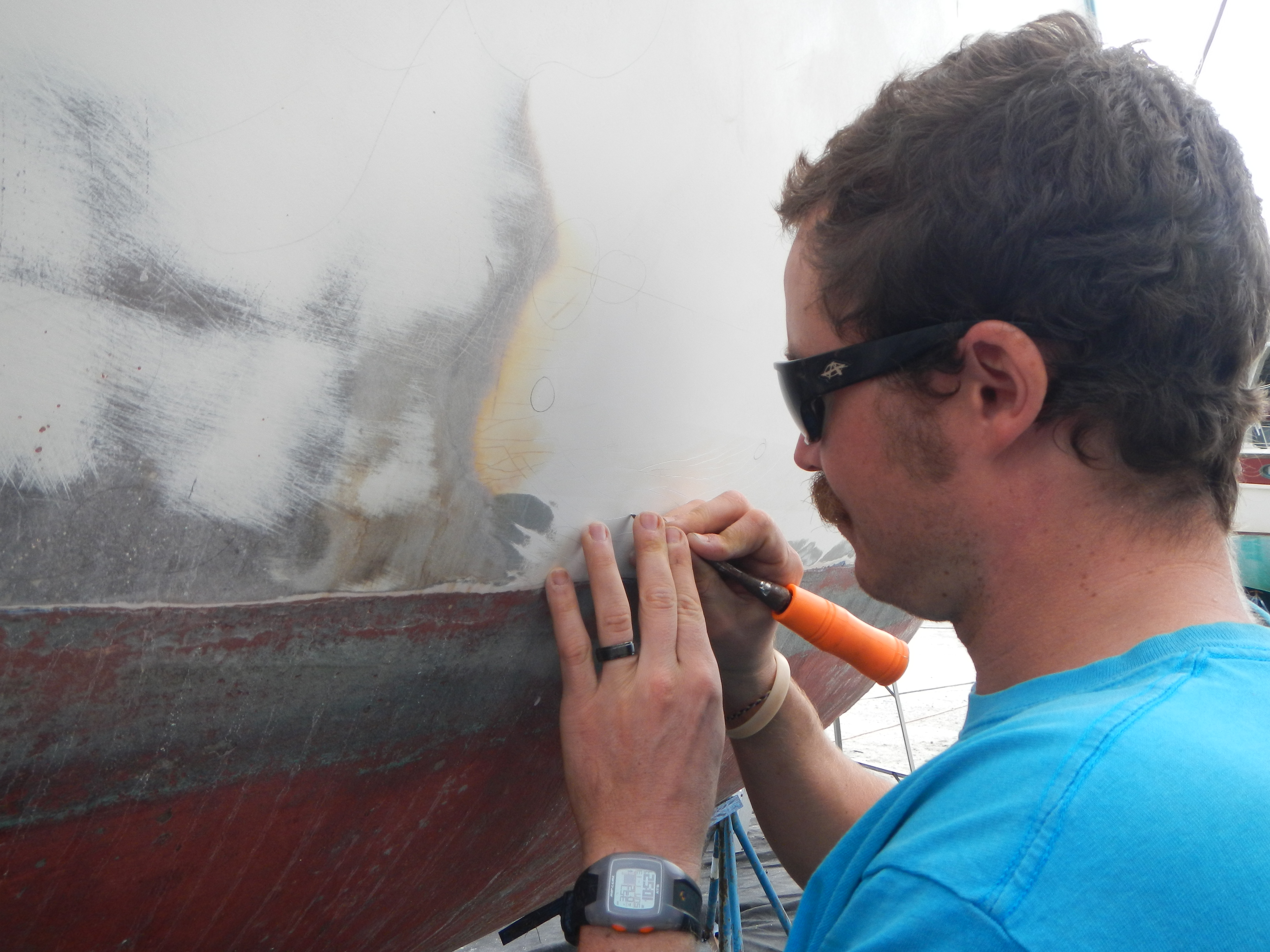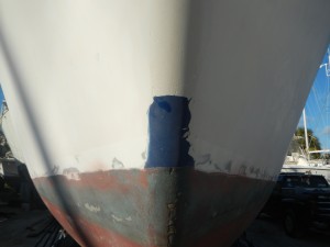 … with the first round of sanding. We got alot done this past weekend. After sanding the entire day Saturday and most of Sunday, we finished sanding off the old paint. I started filling old screw holes and also carving out some cracks in the hull. Apparently there has been quite a few repairs over her lifetime. I guess that makes sense since she was a charter boat for her first few years until she hit a reef and basically sunk. Laurel and I also managed to remove the four thru-hulls we wanted