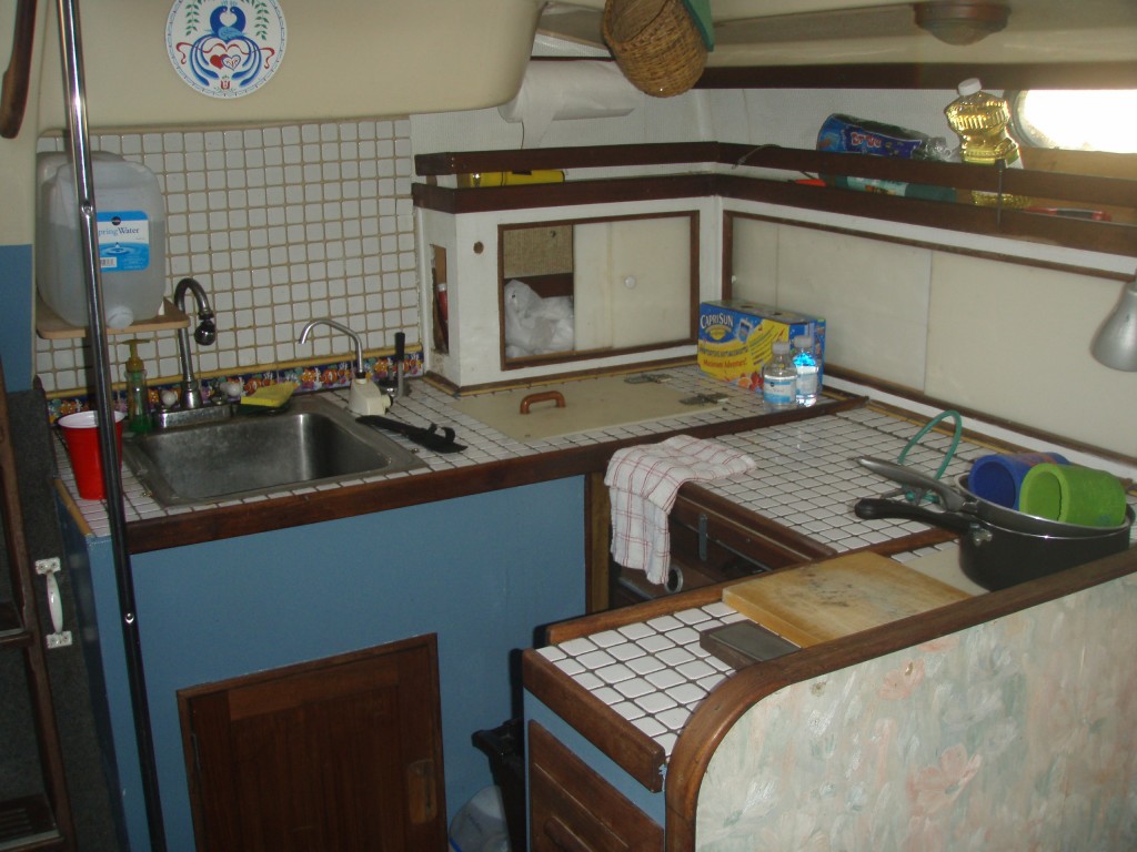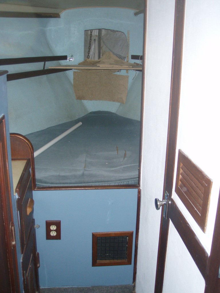 The interior was bizarre. The previous owner wall papered the teak bulkheads, carpeted everything that wasn’t wallpapered, put recliner chairs in to watch tv and tiled the galley. The holding tank was under the bunk and was plumbed with the wrong tubing. It stunk.
