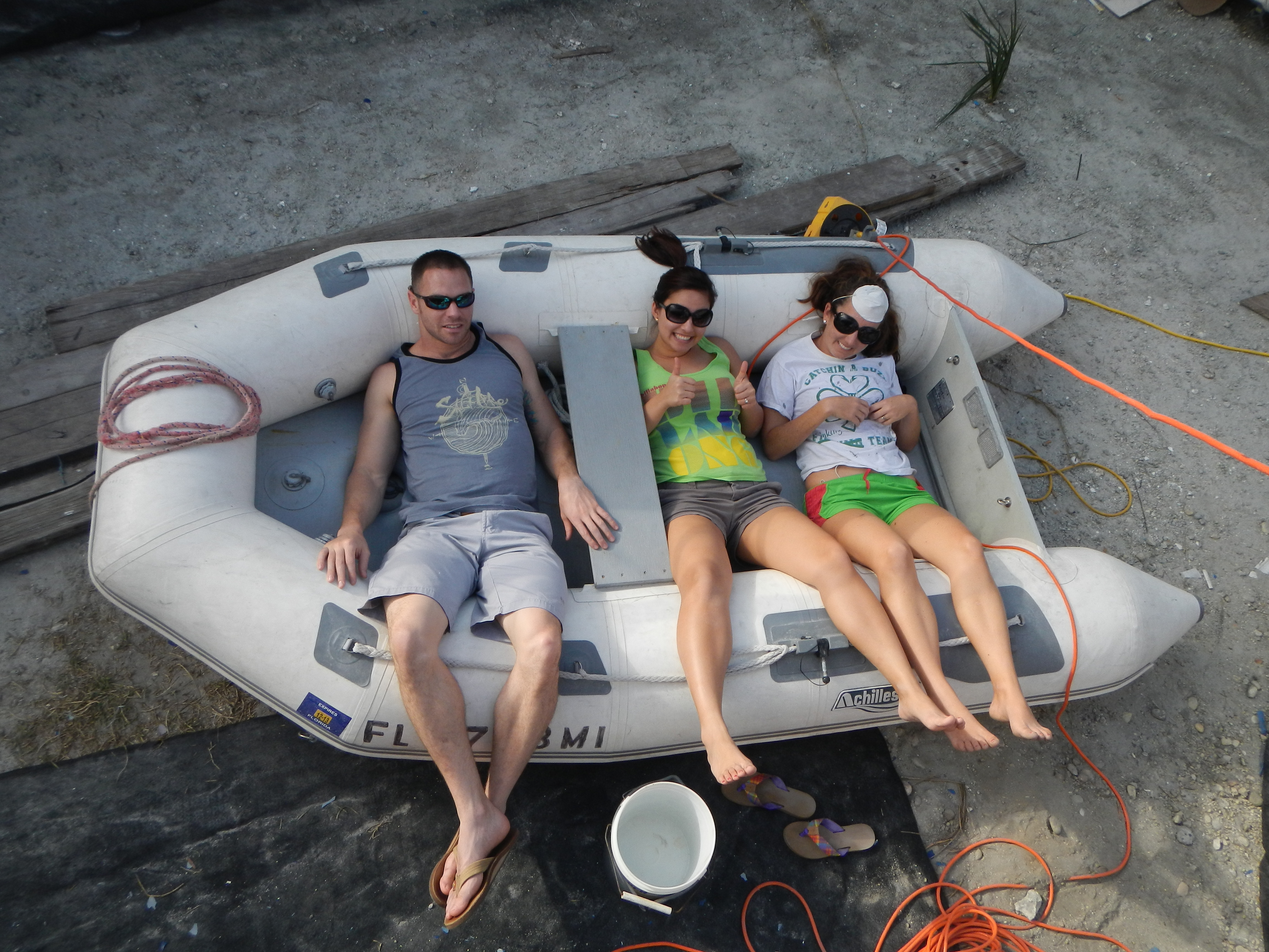 We stayed busy all weekend working on the boat. Our friends Rich and Sarah stopped by to check out our progress. We put them to work scraping the bootstripe off. They very quickly found comfort in the dinghy. Thanks for the help guys!